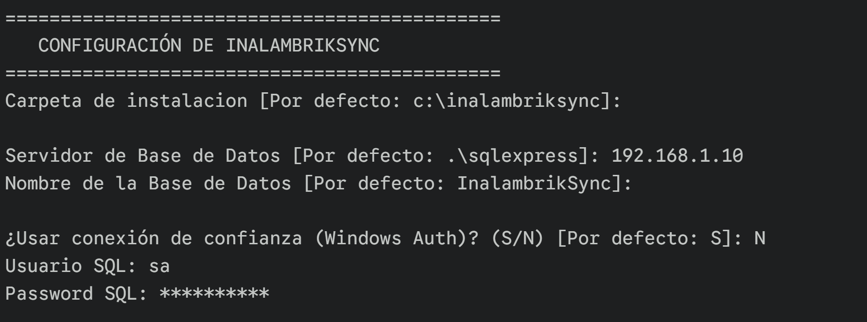 El sistema le pedirá la carpeta destino y los datos del servidor SQL. Si presiona Enter sin escribir nada, se usarán los valores por defecto (mostrados entre corchetes).
