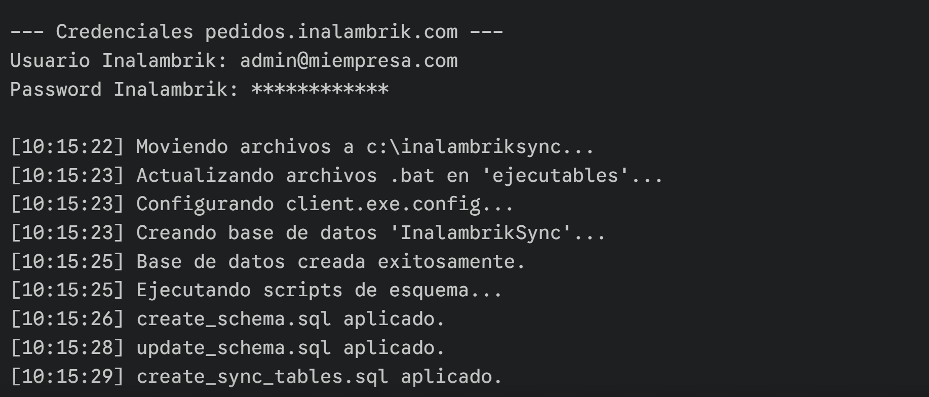 Aquí deberá ingresar sus credenciales de pedidos.inalambrik.com. Una vez ingresadas, el script comenzará a mover archivos y configurar el sistema automáticamente.