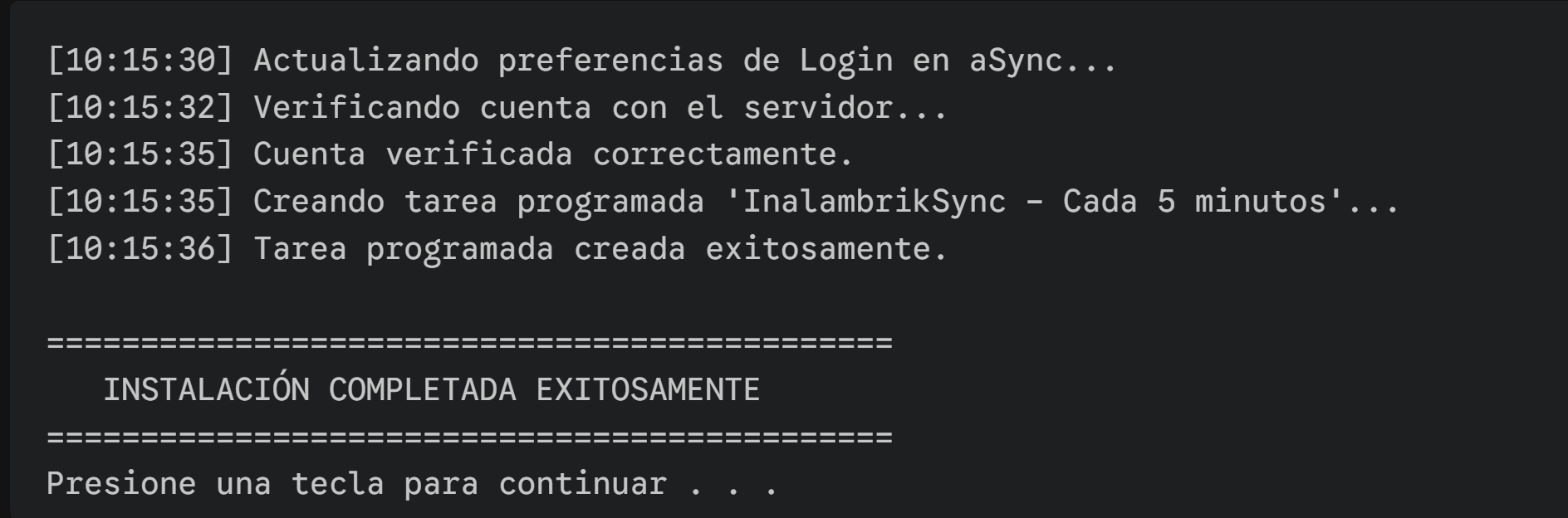 El script intentará conectarse a la nube usando aSync.exe. Si la verificación es correcta, creará la tarea programada y finalizará.