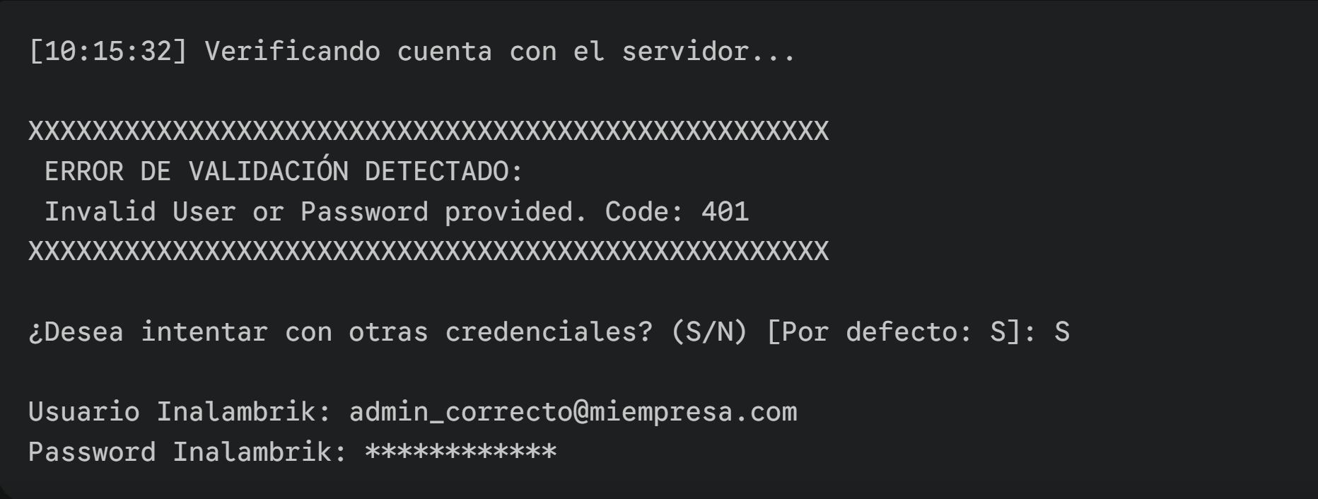 Si las credenciales de Inalambrik son incorrectas, el instalador NO se cerrará. Le mostrará el error devuelto por el servidor y le permitirá intentar nuevamente sin tener que reiniciar todo el proceso.