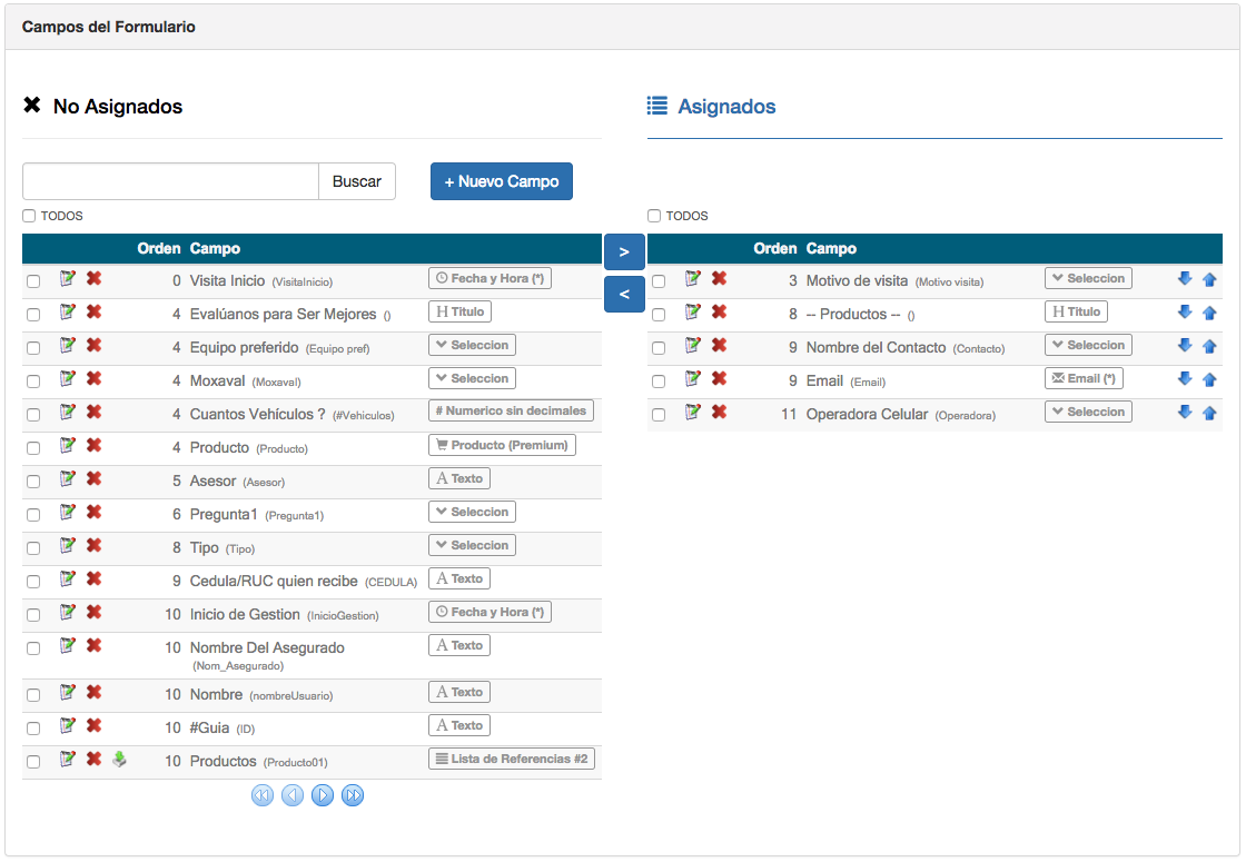 El usuario podrá usar las siguientes acciones para asignar/remover campos al formulario seleccionado: