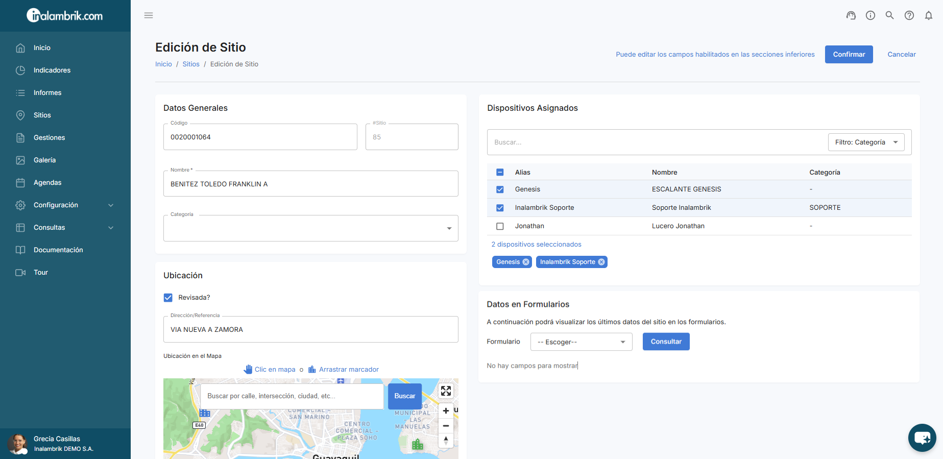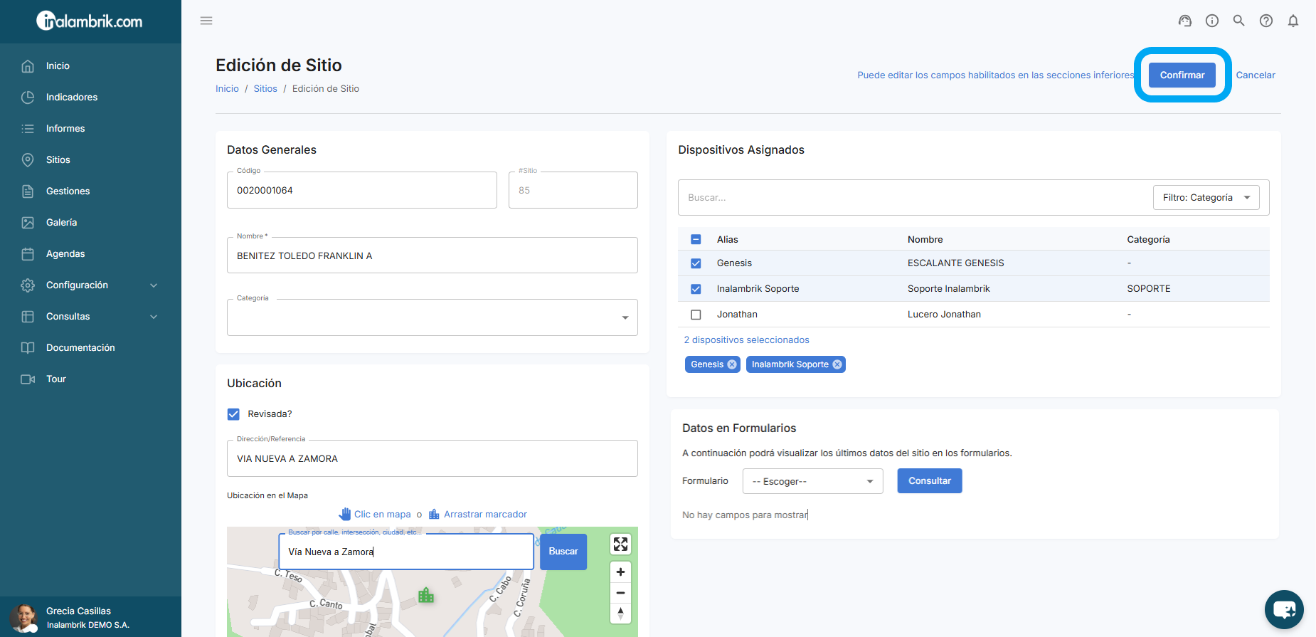 Ahora el sitio está en modo Edición. Realice los cambios requeridos en los Datos Generales del sitio o la asignación de dispositivos.