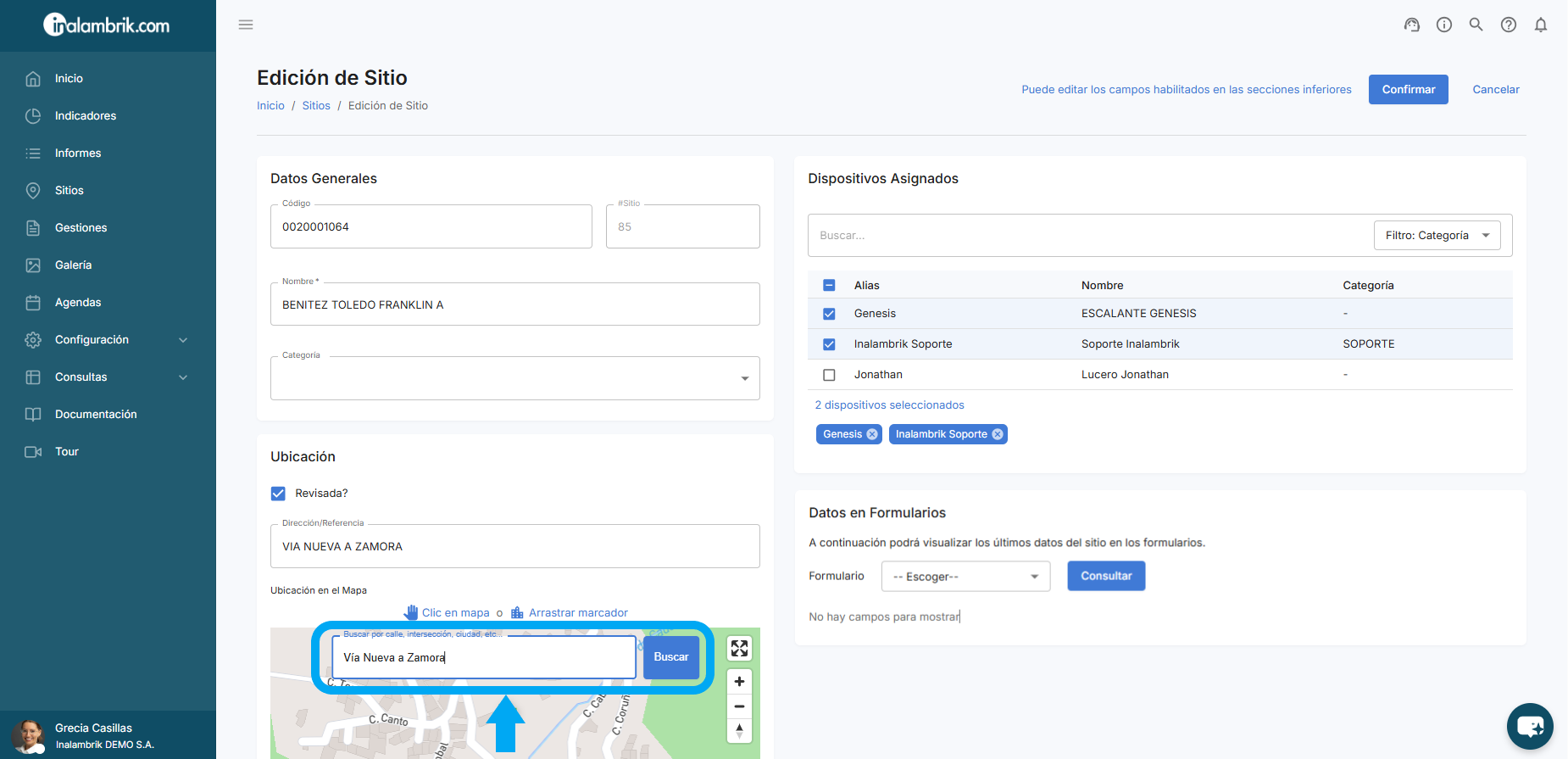 Para modificar la ubicación del sitio, busque la dirección del cliente en el mapa y haga clic en la ubicación para georreferenciarlo.