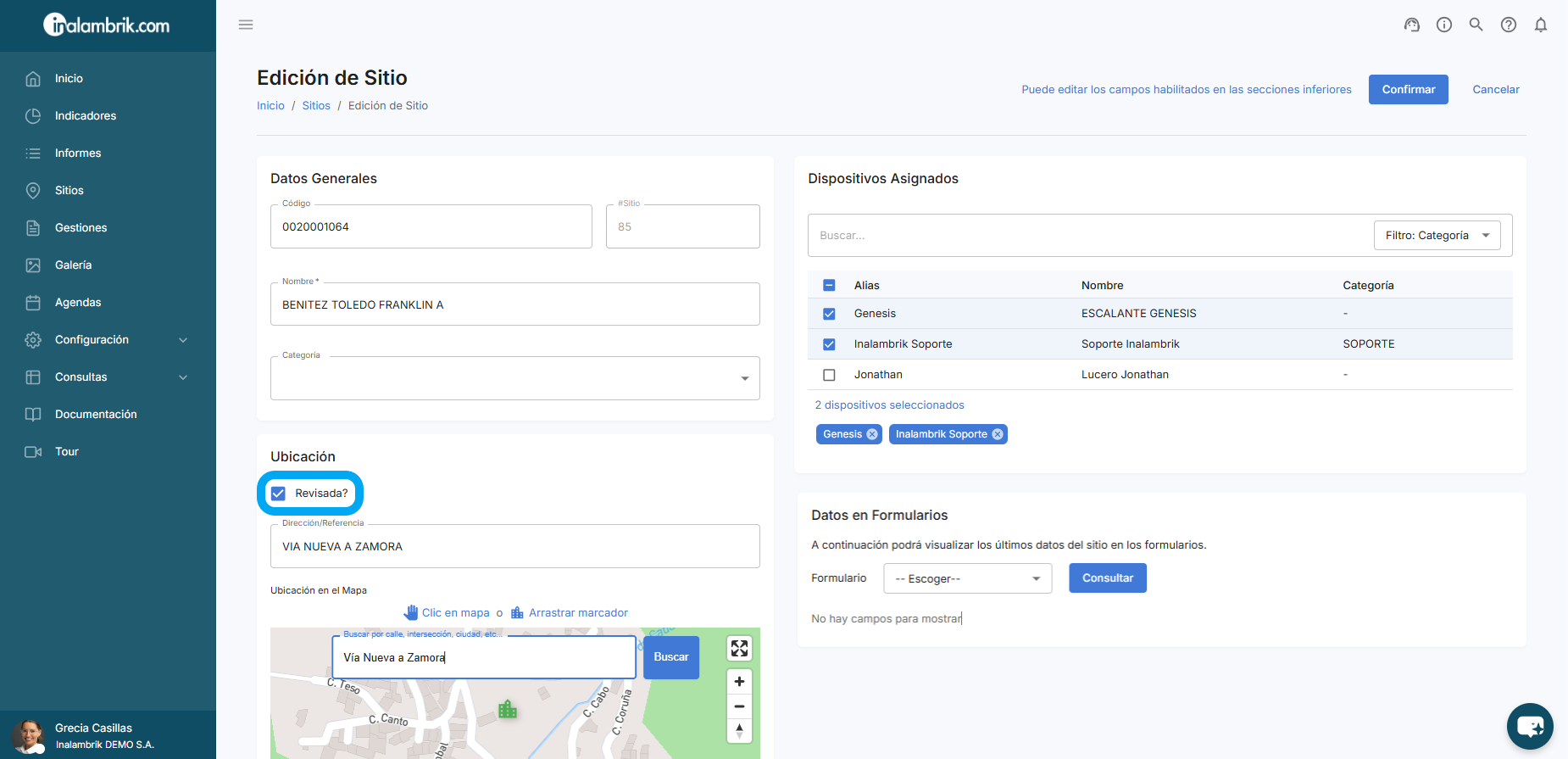 Luego marque la opción "Revisada?" para indicar que aprueba la ubicación del Sitio y finalmente haga clic en el botón Confirmar.