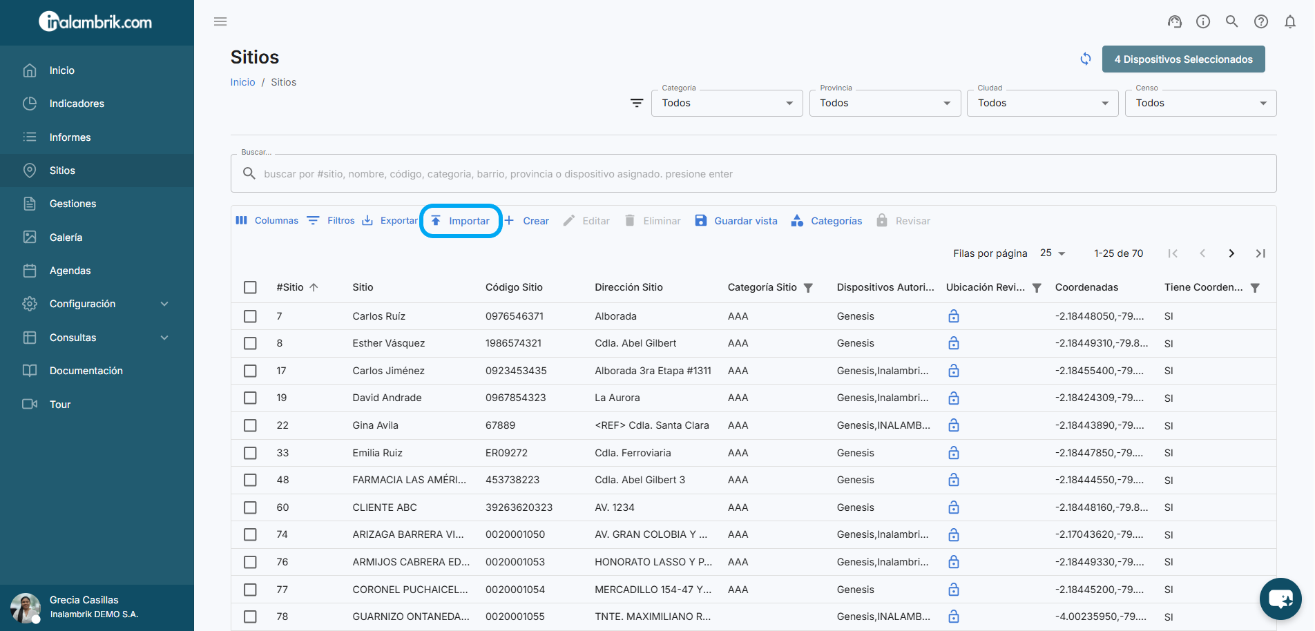 4. Revisión de Categorías y Dispositivos (GPS) Para que la importación sea exitosa, cualquier categoría que coloque en el Excel debe haber sido creada previamente en la plataforma; de lo contrario, el sistema le avisará del error. Además, el sistema leerá la información de los dispositivos (GPS) indicados en el archivo y los vinculará al sitio automáticamente para que pueda monitorearlos sin pasos extra.