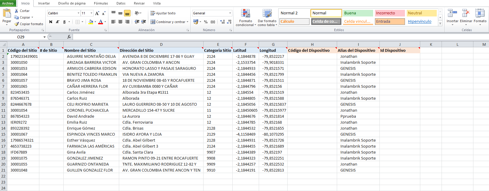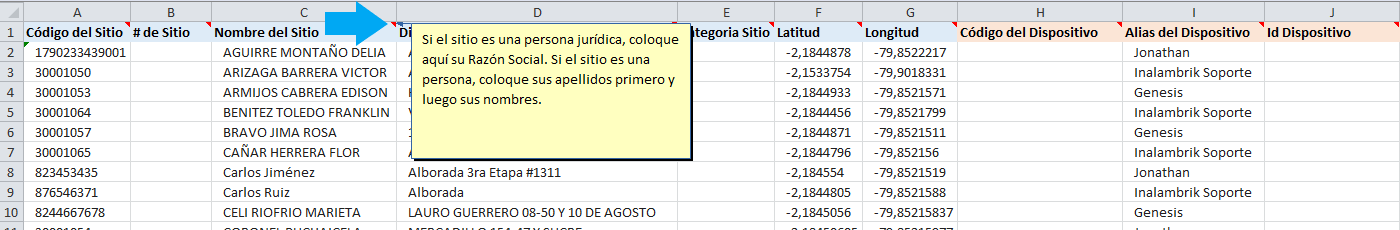 Llene las columnas requeridas en la plantilla de importación, es decir: Código del Sitio, # de Sitio, Nombre del Sitio, Dirección del Sitio, Categoría Sito (que ya exista en el sistema), Latitud, Longitud y Código/Alias/Id Dispositivo.