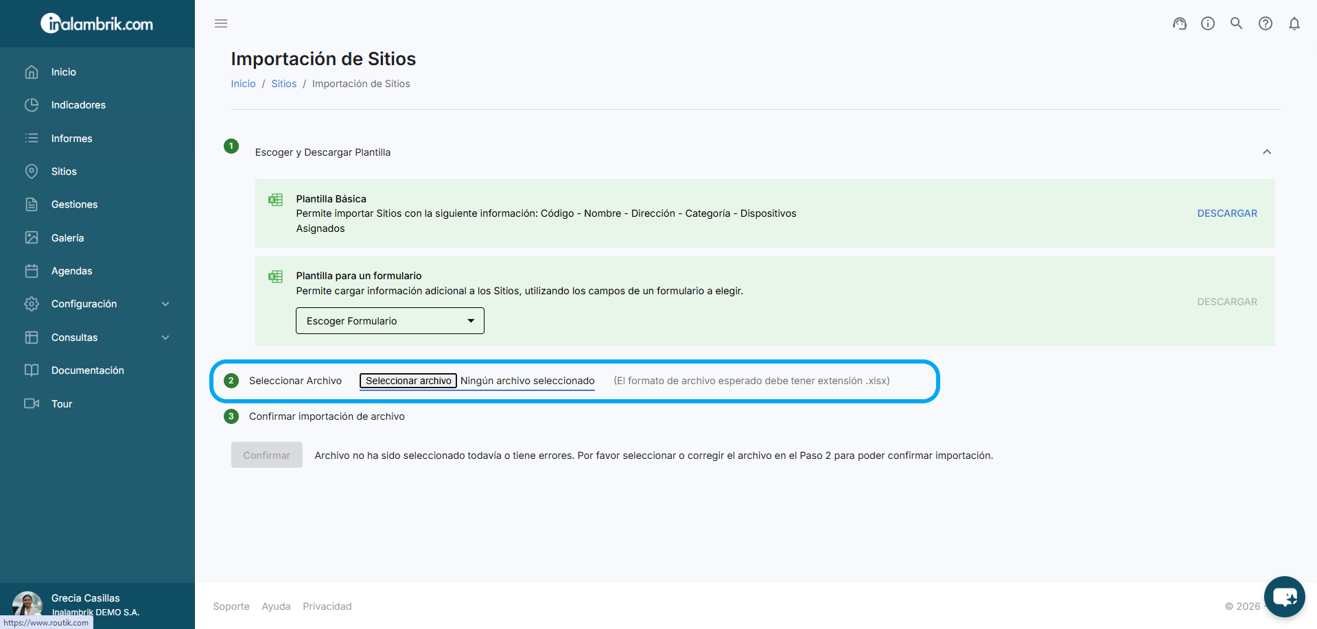 7. Una vez tenga lista la plantilla diríjase a Sitios/Importar/Seleccionar archivo y haga clic en el botón Confirmar.