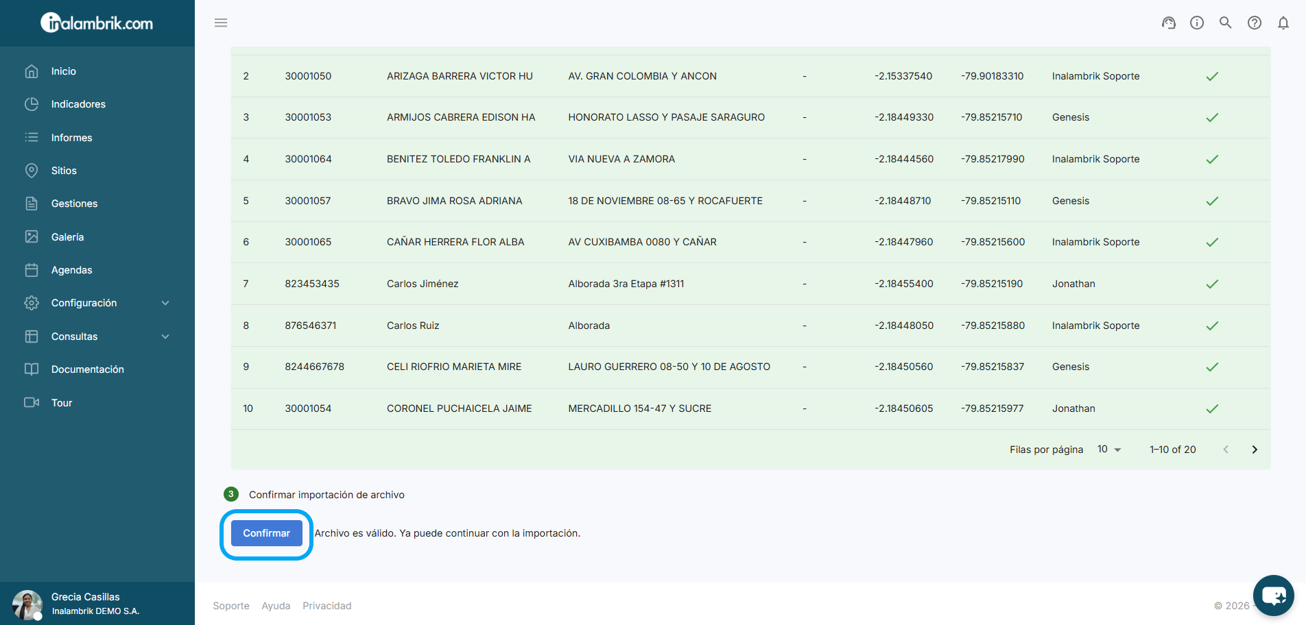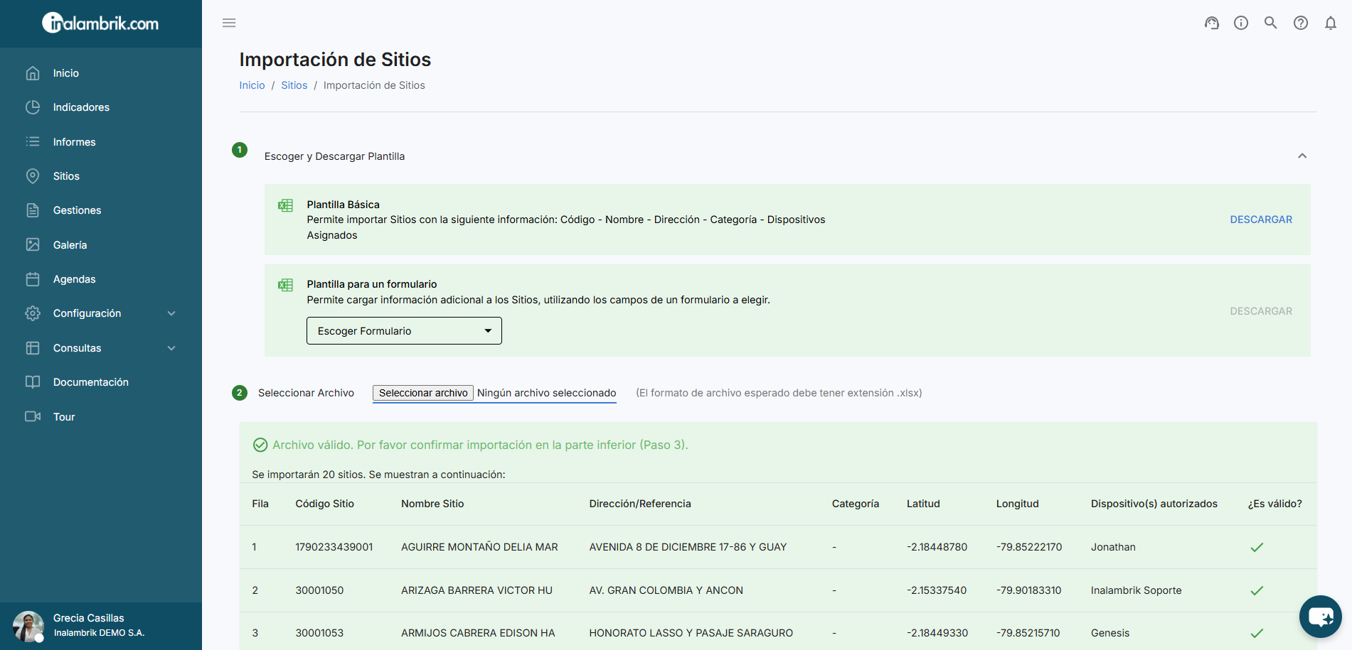 6. Verifique los sitios a importar en el portal web. En caso de existir errores en la plantilla se le notificará.