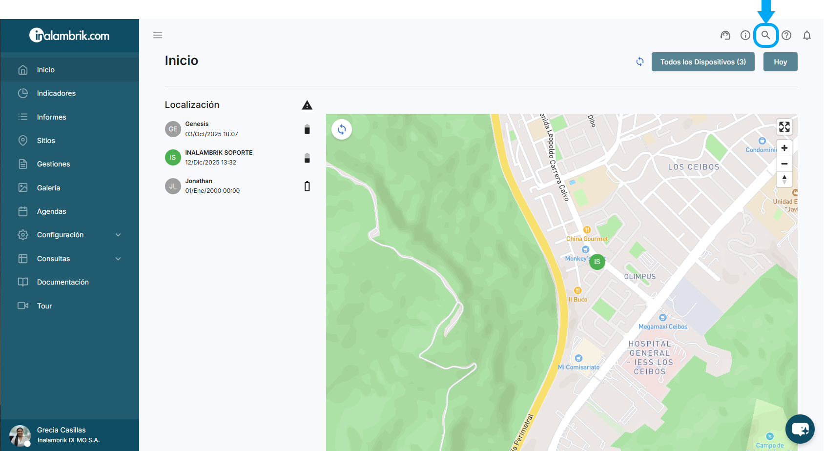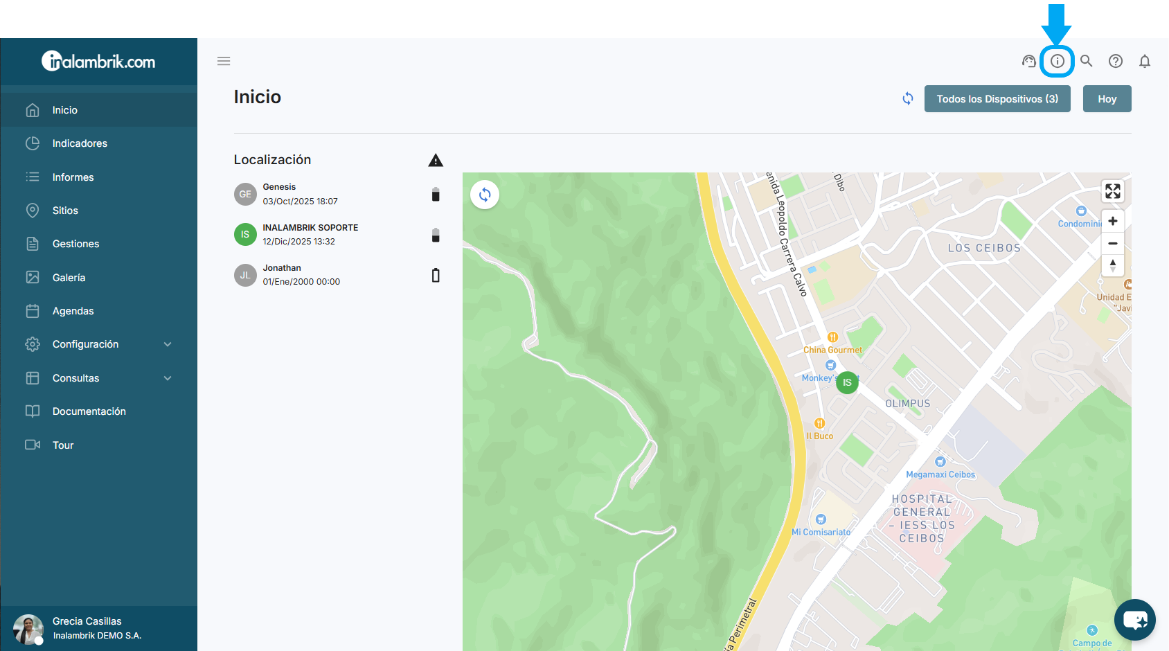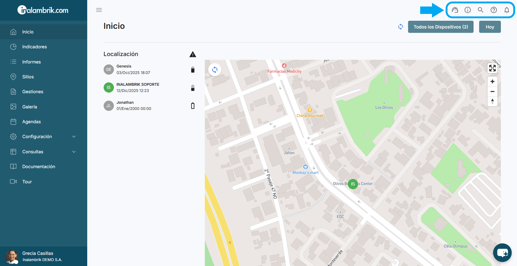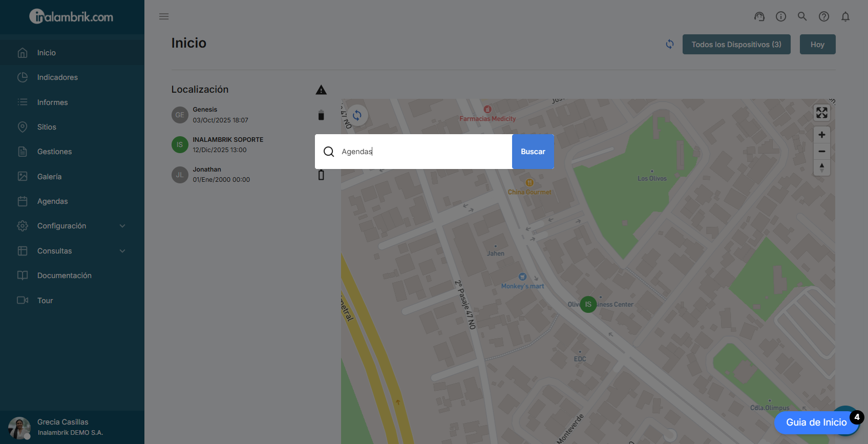 Escoja los dispositivos que requiera considerar para consultar los indicadores de la sección de Inicio y visualizar en el mapa su localización. Haga clic en el botón Todos los Dispositivos.