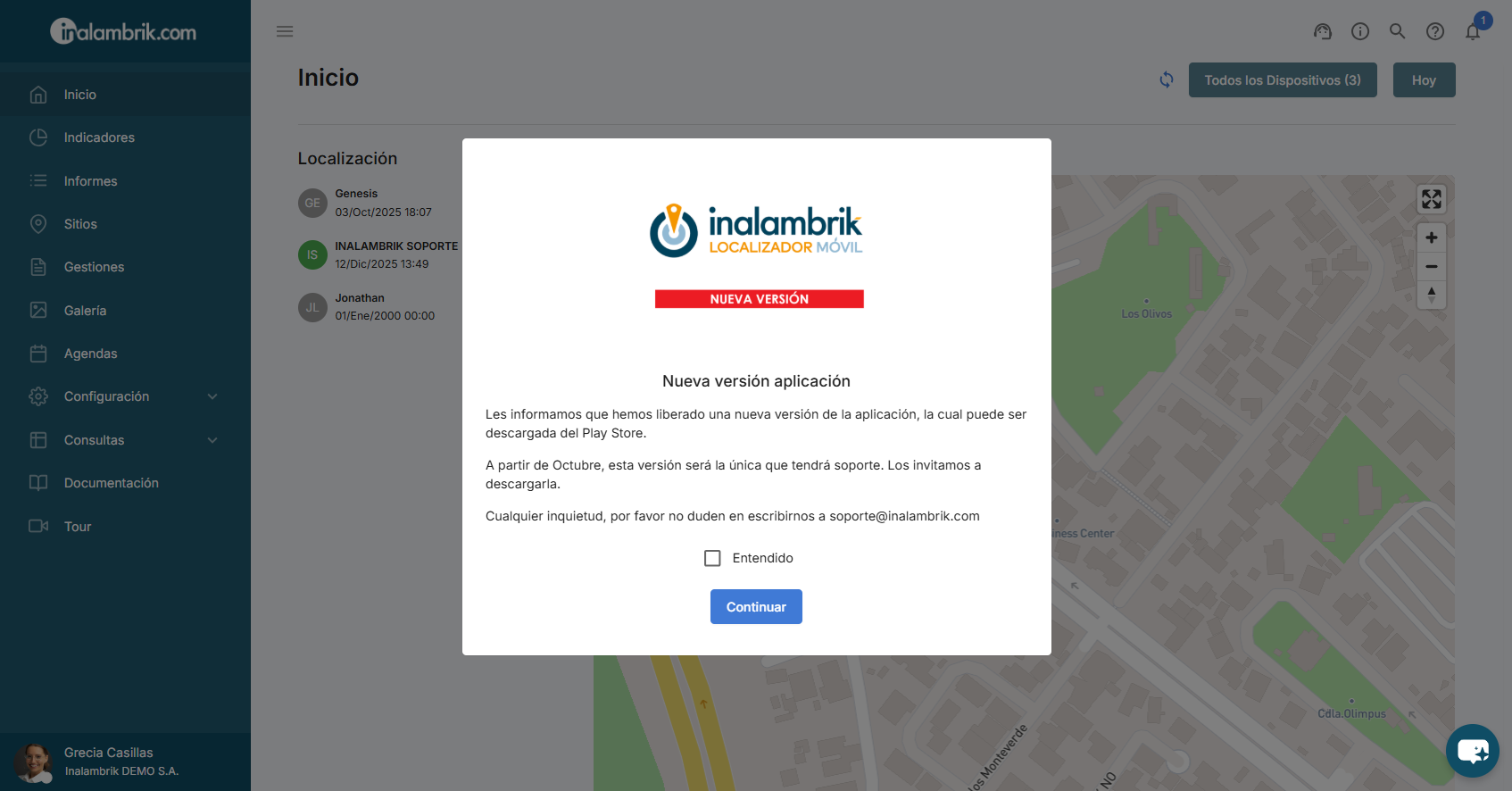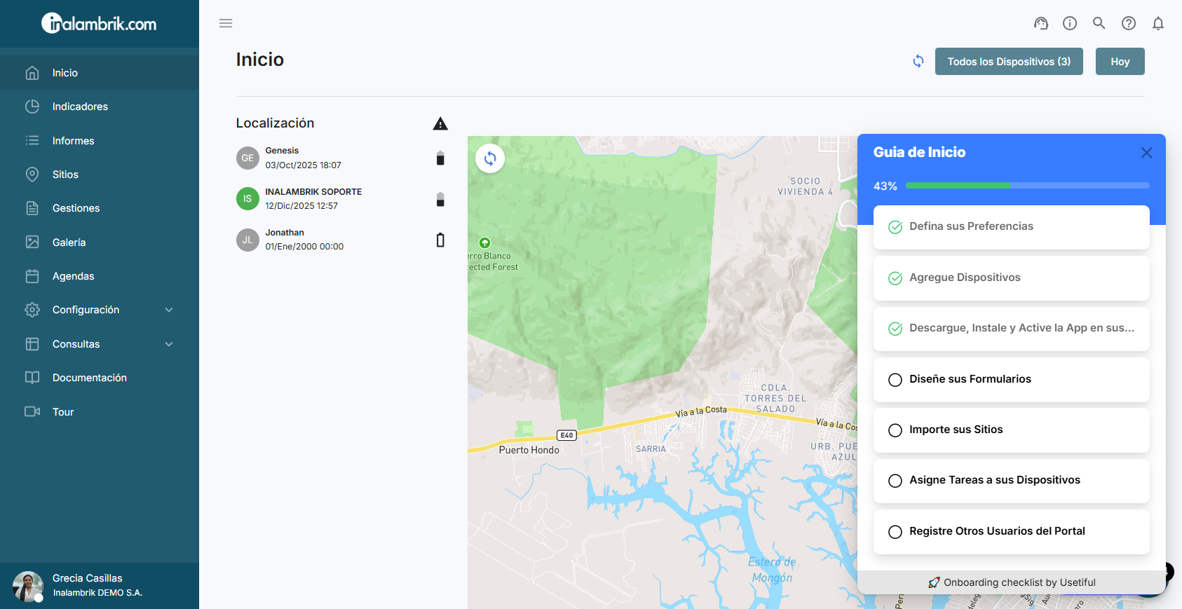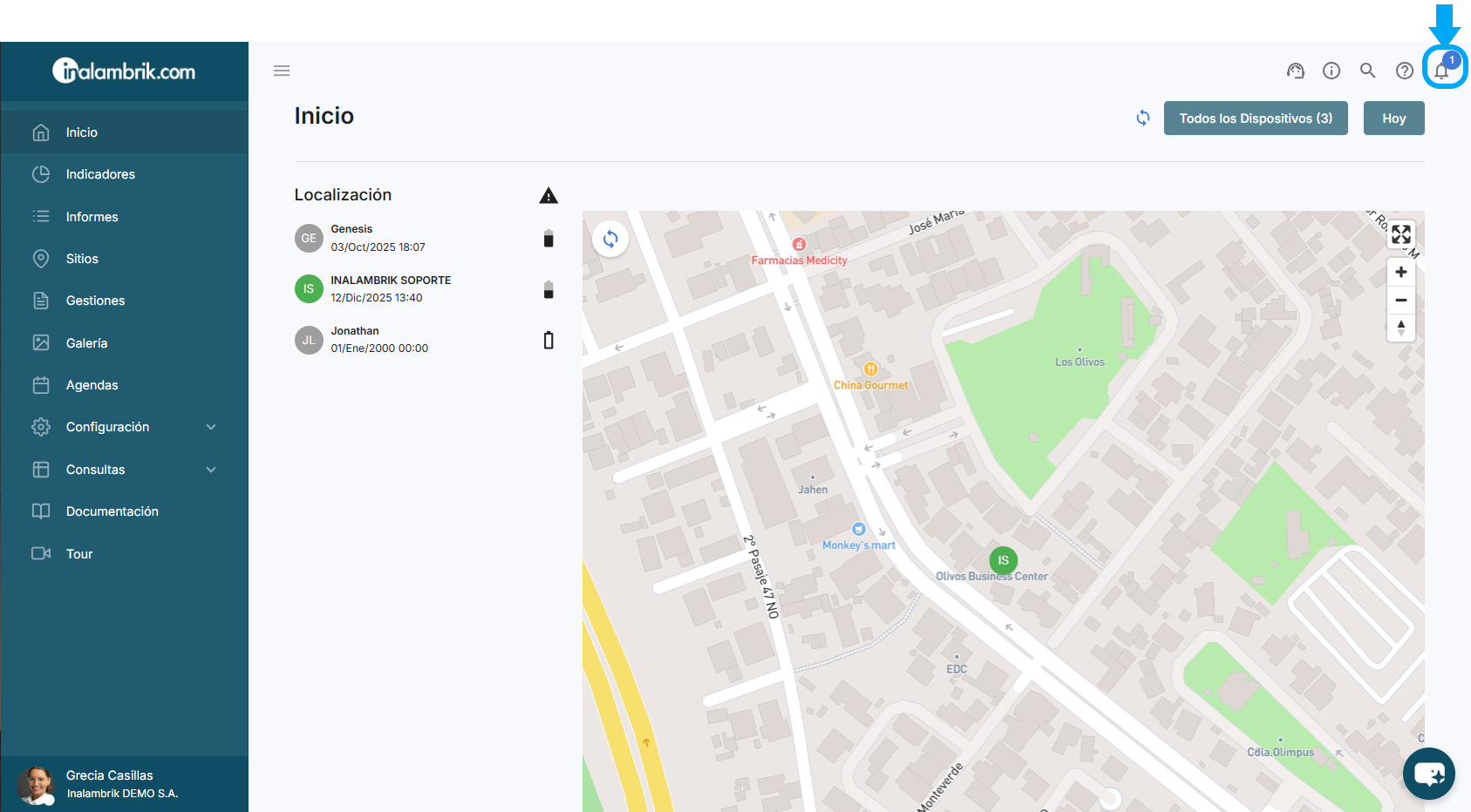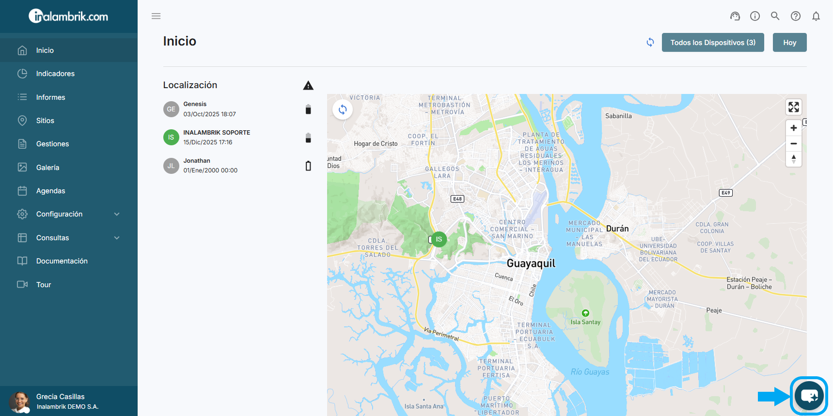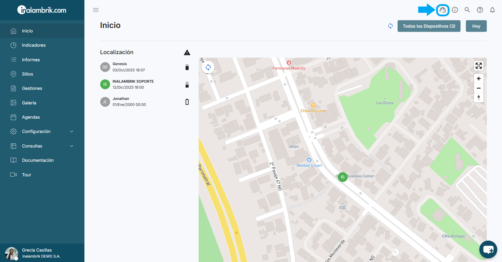 Escoja los dispositivos que requiera considerar para consultar los indicadores de la sección de Inicio y visualizar en el mapa su localización. Haga clic en el botón Todos los Dispositivos.