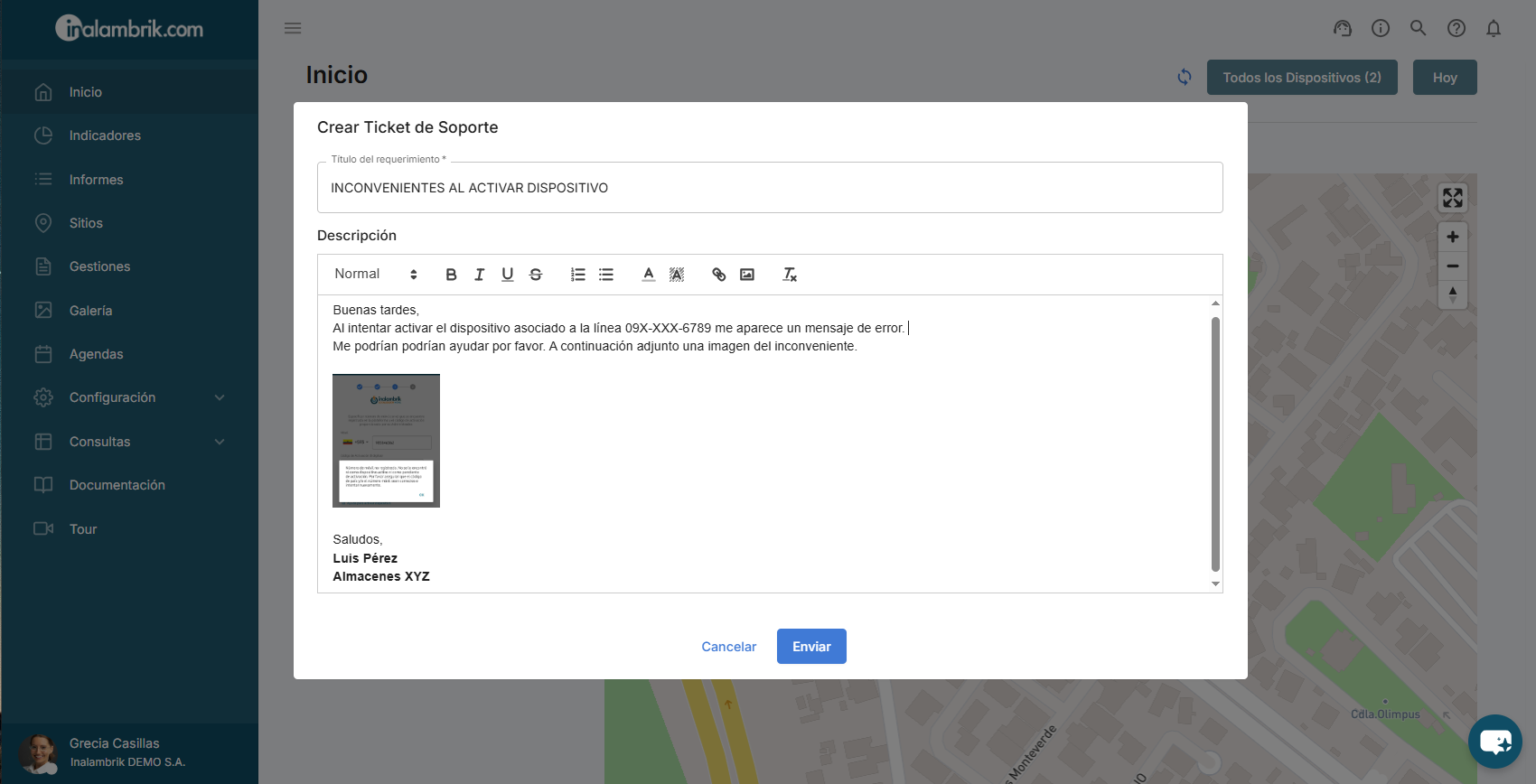 Detalle sus consultas o requerimientos y haga clic en Enviar. Puede adjuntar fotos.