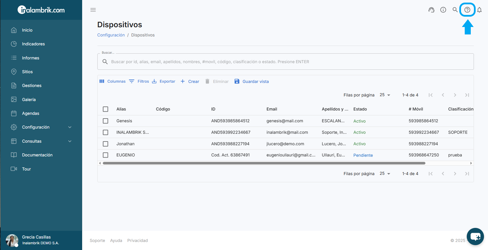 -Ayuda sobre el Panel Actual: En cada panel también encontrará el icono de ayuda como se muestra a contiuación. Haga clic para acceder a la documentación relacionada al panel en que se encuentra. En el siguiente ejemplo nos encontramos en el panel de Dispositivos: