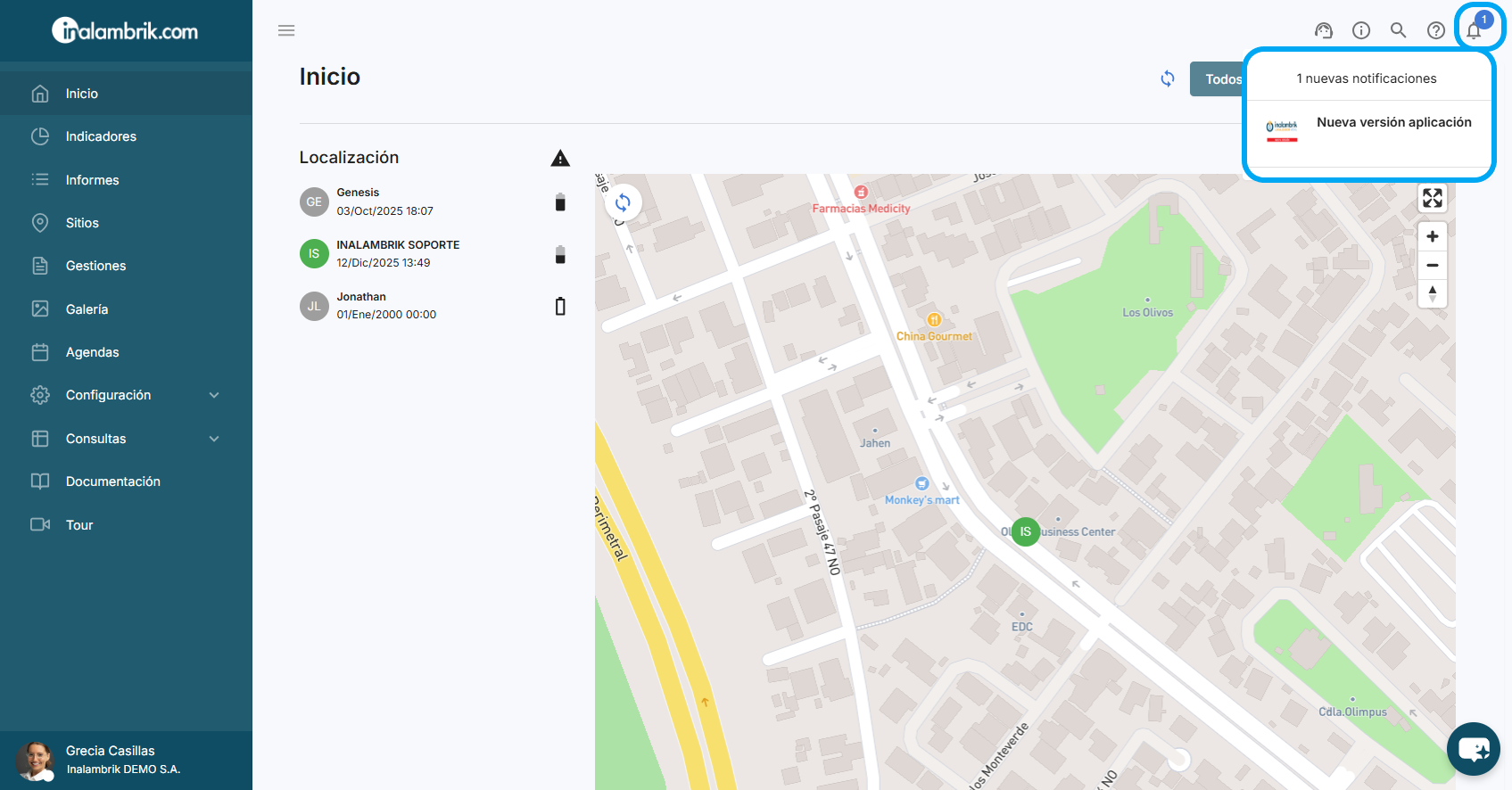 En el siguiente ejemplo hay una nueva notificación que comunica que existe una nueva versión de la aplicación. Haga clic sobre la notificación para leer la noticia completa.