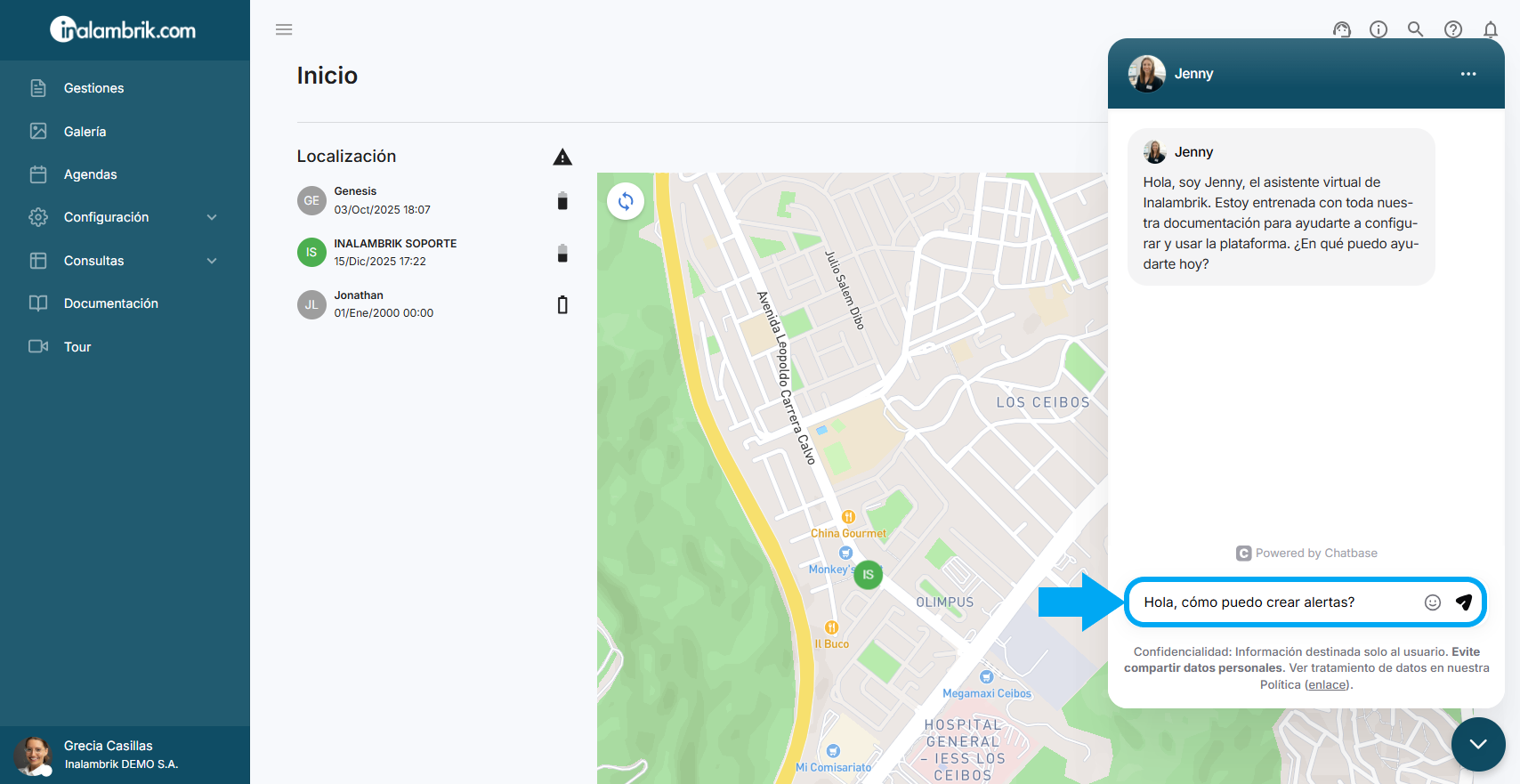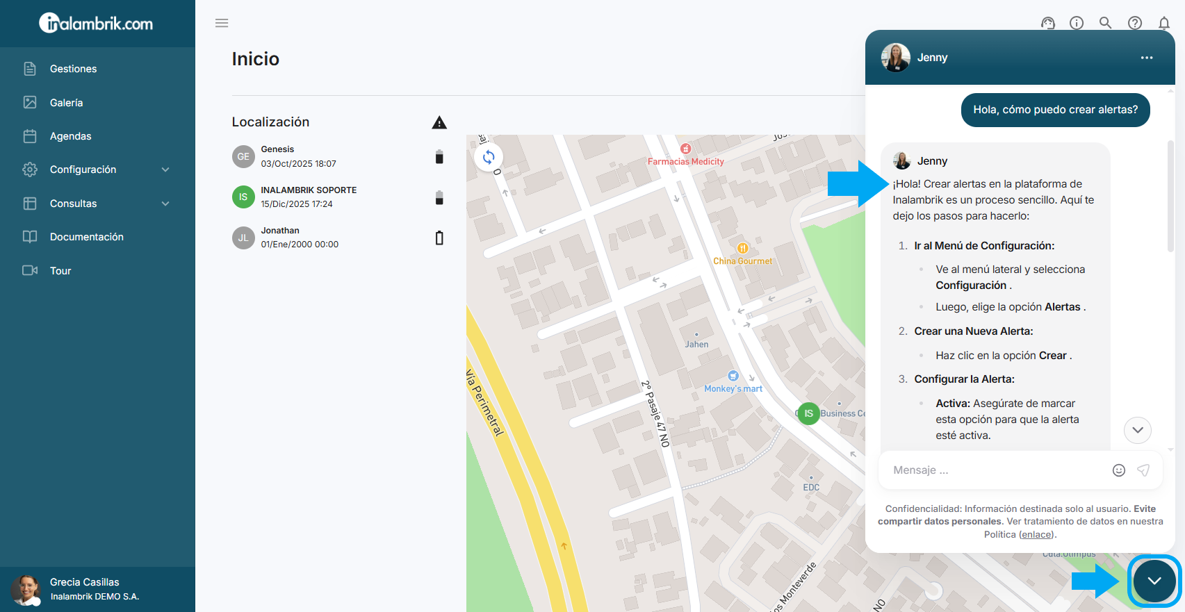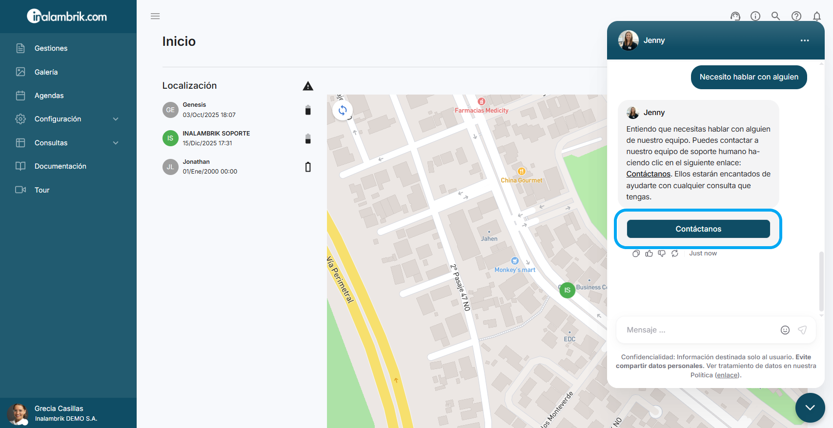 En caso de requerir contactarse directamente con un agente de soporte del personal inalambrik, puede indicarselo a Jenny como en el siguiente ejemplo. Haga clic en el botón "Contáctanos" para abrir un ticket, este le llegará directamente a los agentes de soporte que atenderán directamente su requerimiento.
