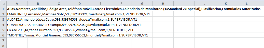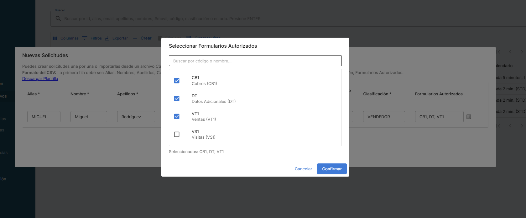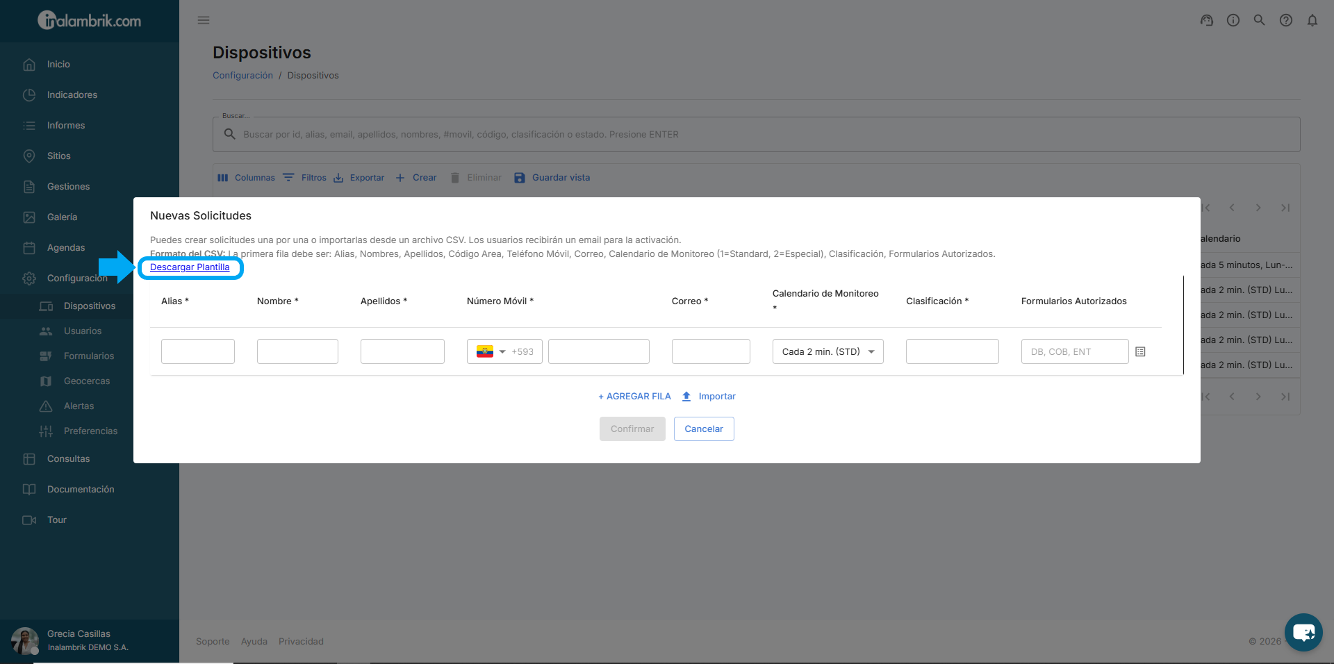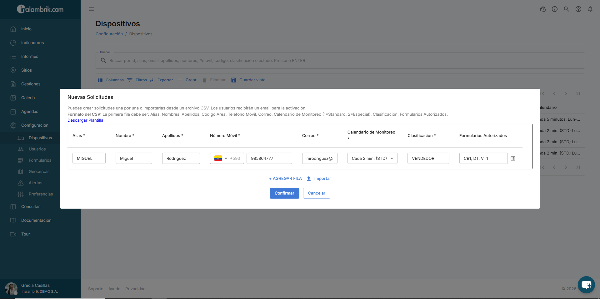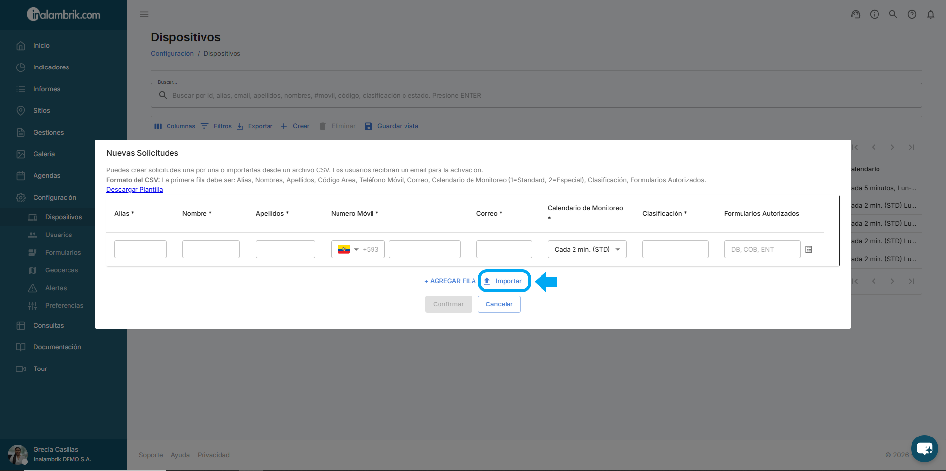 Para la creación de nuevas solicitudes también tiene la opción de cargar un archivo .CSV con los datos de los dispositivos.
