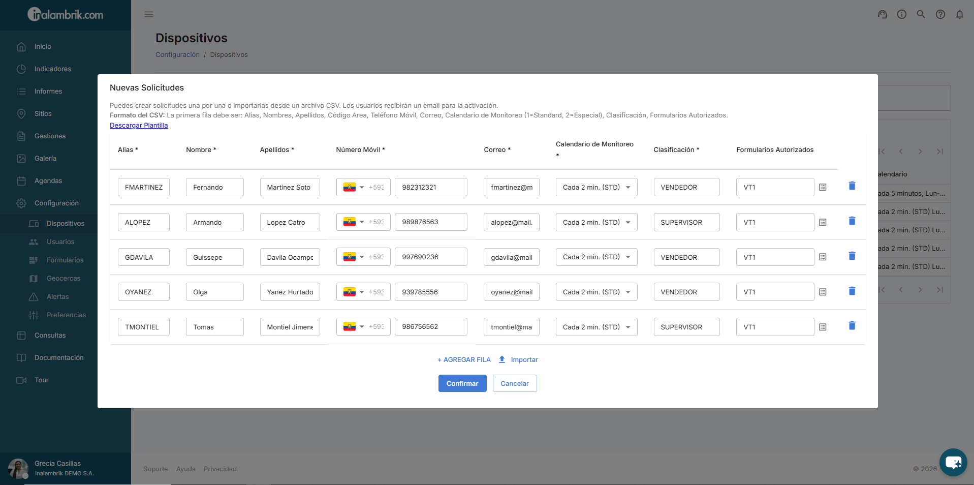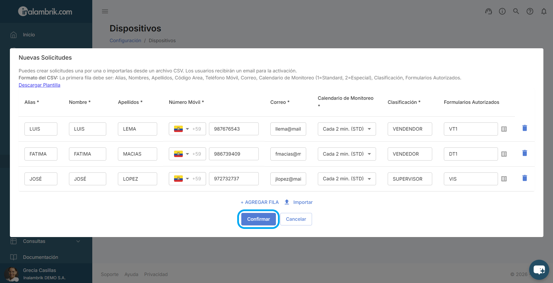 A continuación se mostrarán los datos de los dispositivos que se han incluido en la plantilla, presione el botón Confirmar para finalmente crear las solicitudes.
