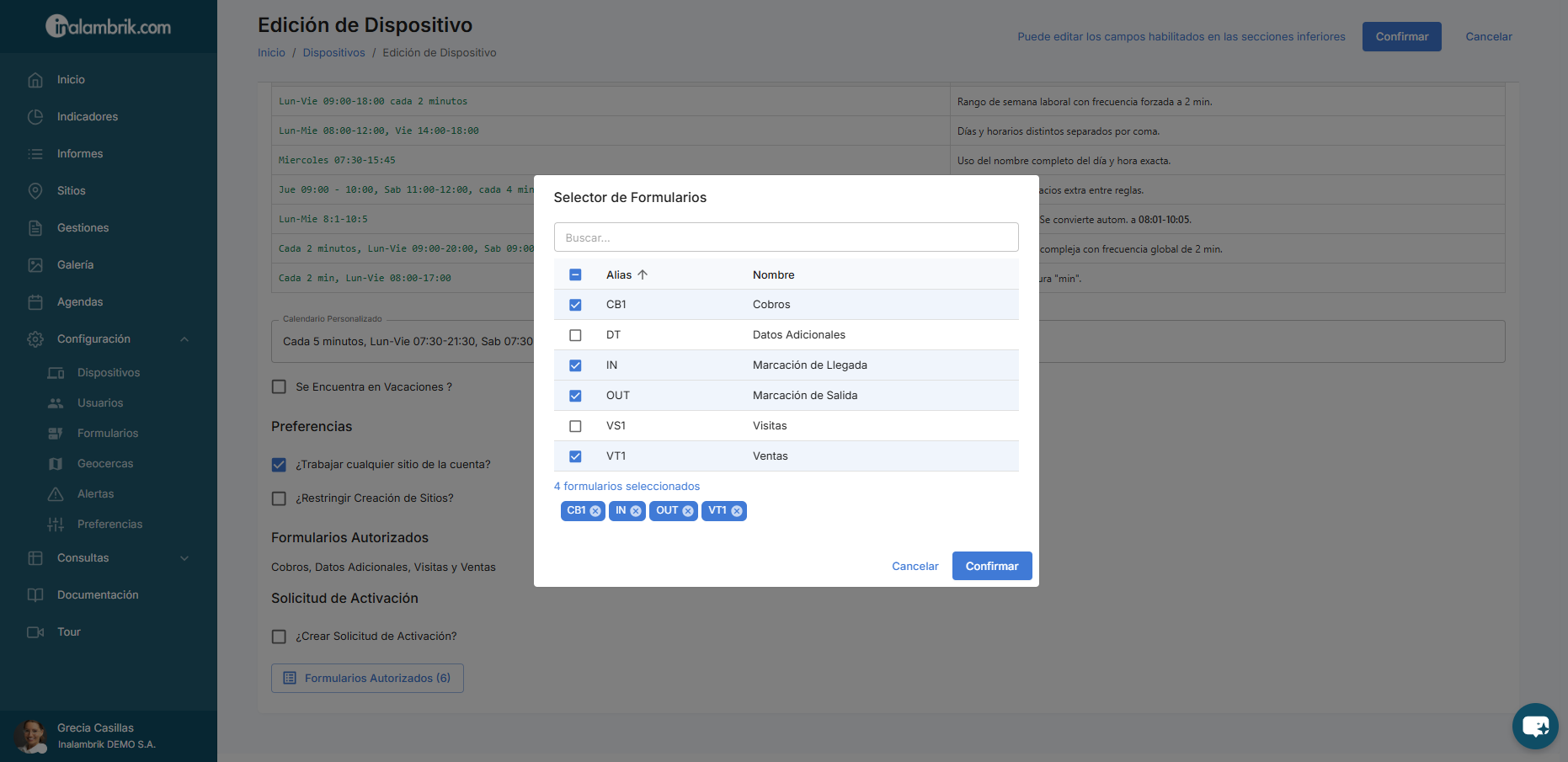 - Formularios Autorizados: Consulte todos los formularios que el dispositivo puede utilizar en las visitas. Al hacer clic en el botón Formularios Autorizados puede seleccionar todos los formularios que requiera asignar al dispositivo. Haga clic en Confirmar para guardar los cambios.