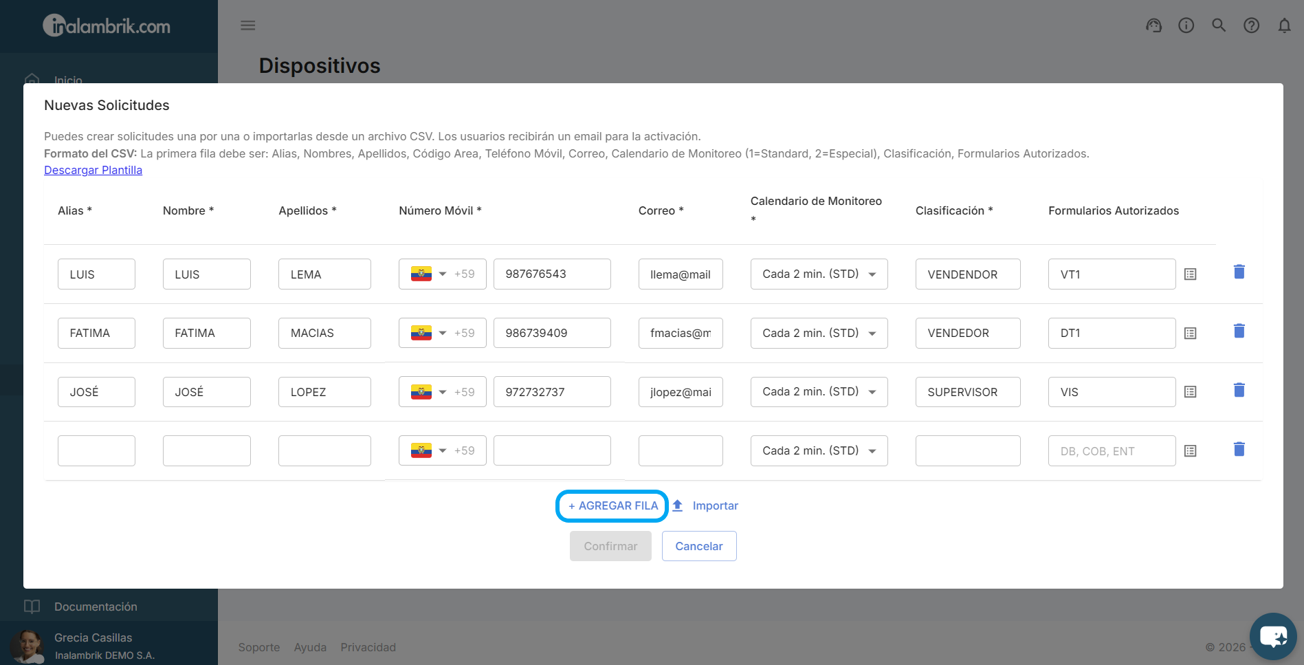 4. En caso de que requiera crear más de un dispositivo, haga clic en la opción AGREGAR FILA para llenar los datos del dispositivo adicional. Puede repetir este paso cuantas veces sea necesario.