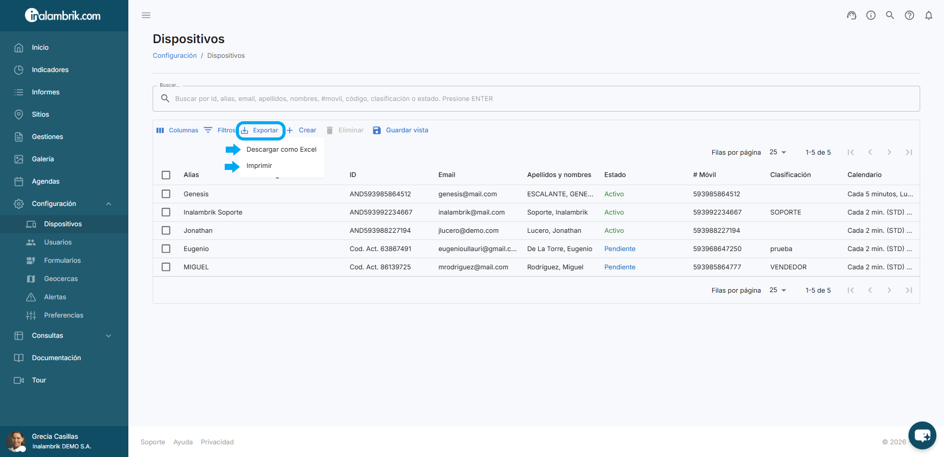 Para obtener un listado de todos los dispositivos de su cuenta, haga clic en Exportar y seleccione la opción de su preferencia.