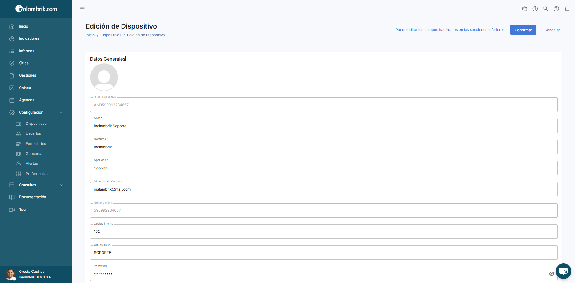 Para modificar los datos de un dispositivo haga clic sobre la fila correspondiente al mismo.