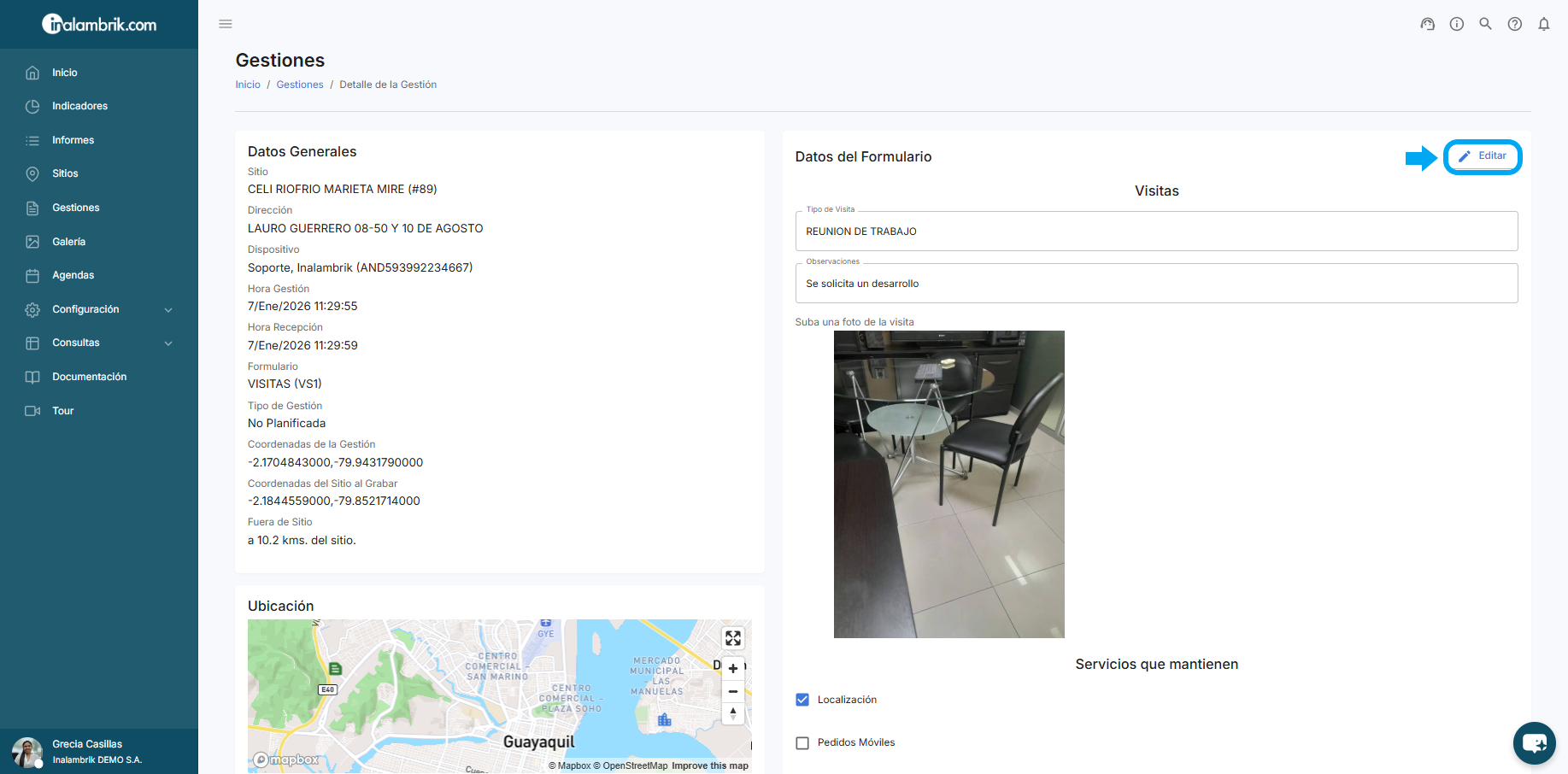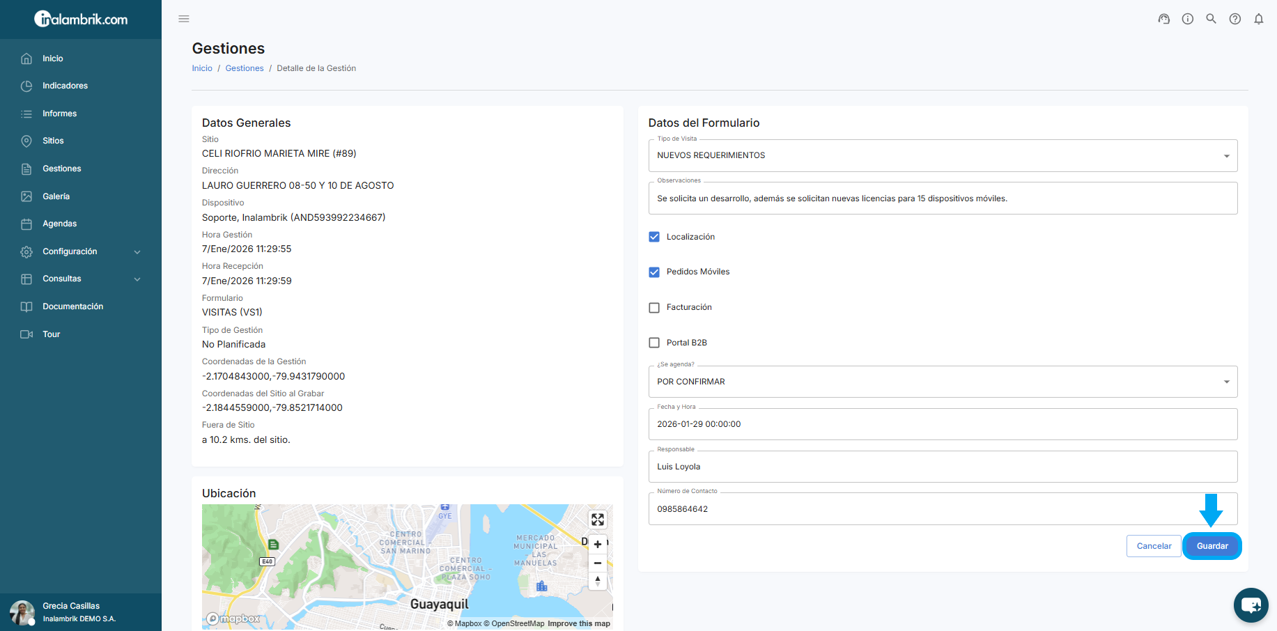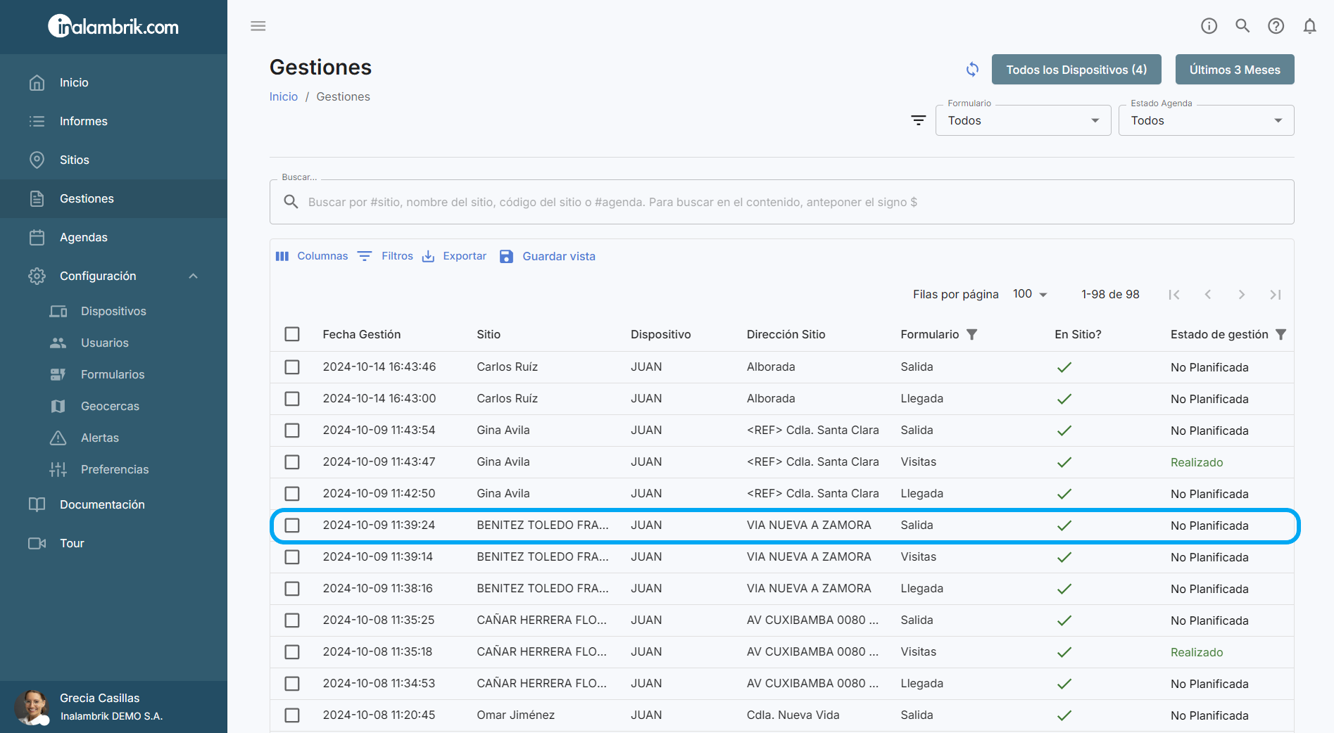En la columna “En Sitio?” podrá verificar rápidamente si la gestión se realizó en la misma ubicación en la que el cliente fue georreferenciado o no.