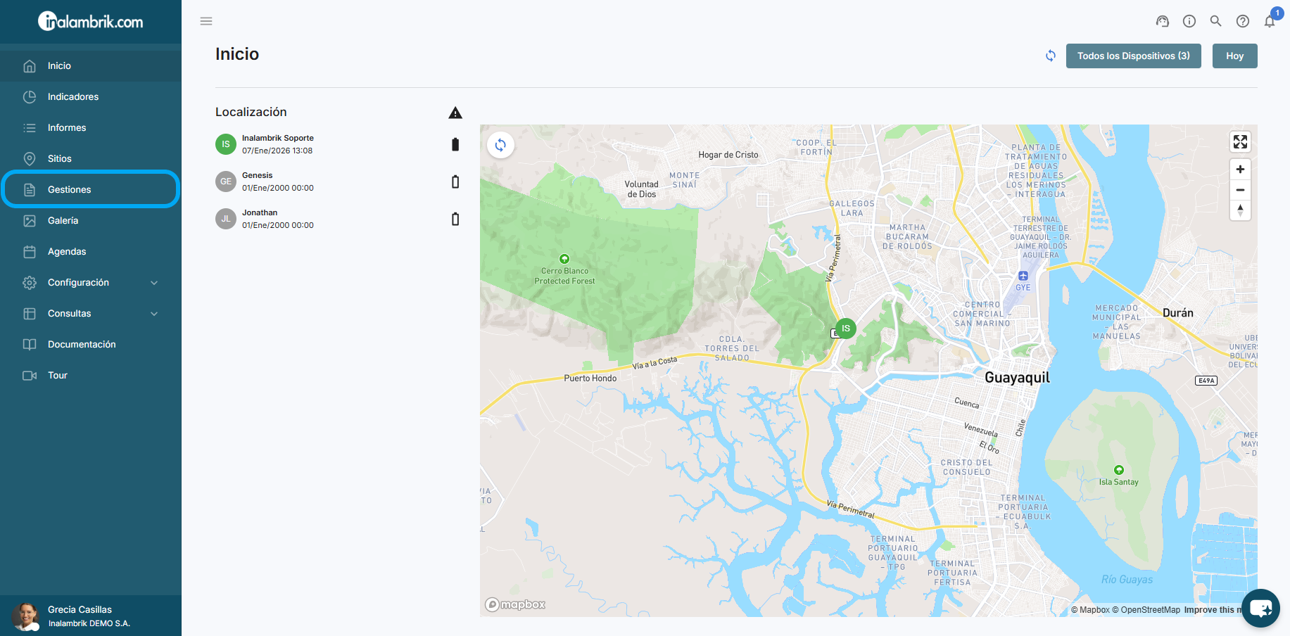 Marque los dispositivos que requiera escoger y finalmente haga clic en el botón Aplicar para que pueda visualizar en el mapa la última ubicación de los dispositivos seleccionados.