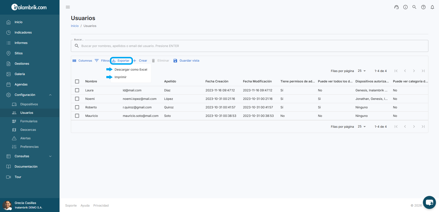 Para obtener un listado de todos los Usuarios de su cuenta, haga clic en Exportar y seleccione la opción de su preferencia.