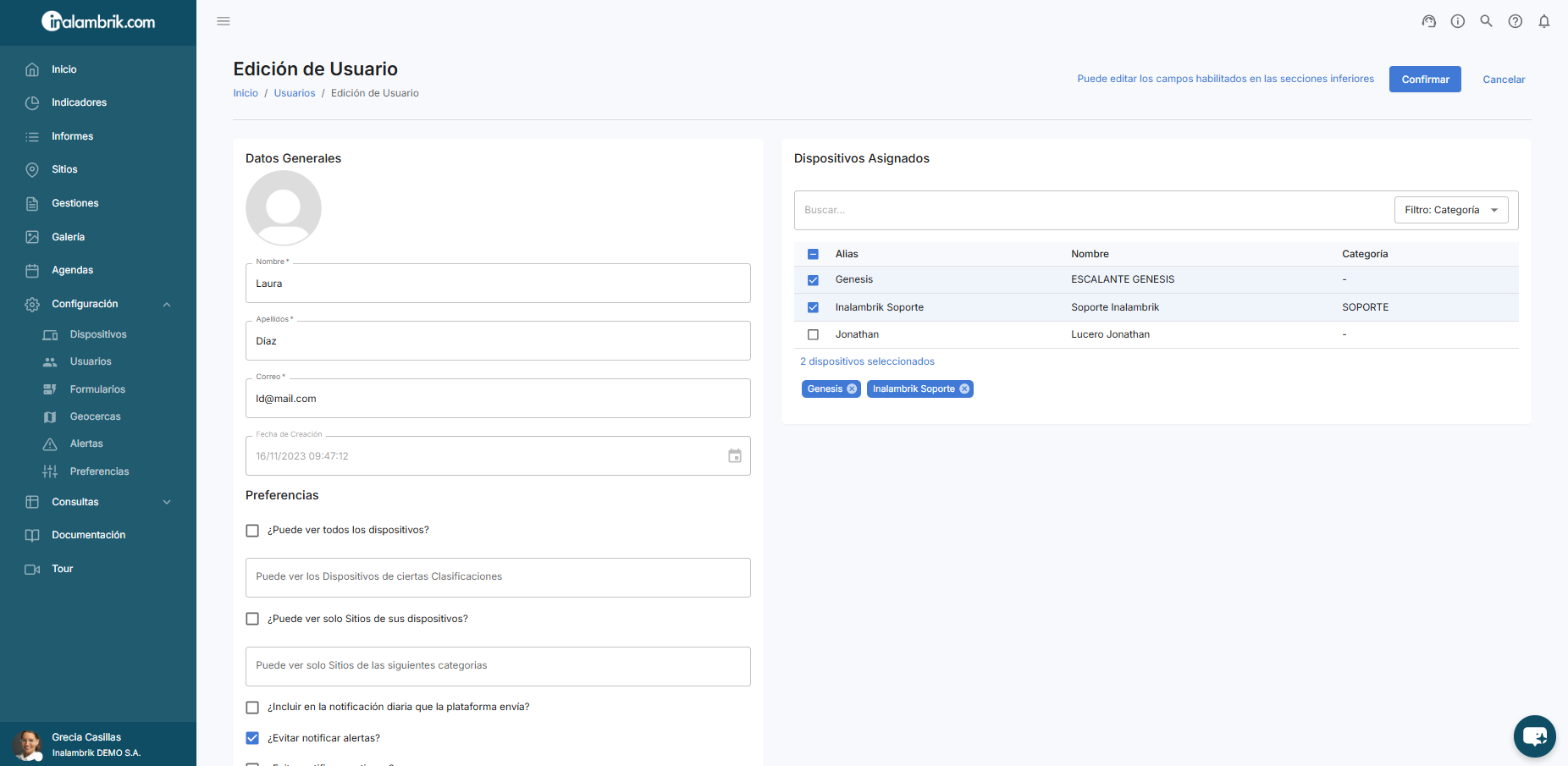 - ¿Evitar notificar alertas?: Active esta opción si prefiere que este usuario no reciba las notificaciones por correo electrónico sobre las alertas generadas por sus dispositivos asignados.