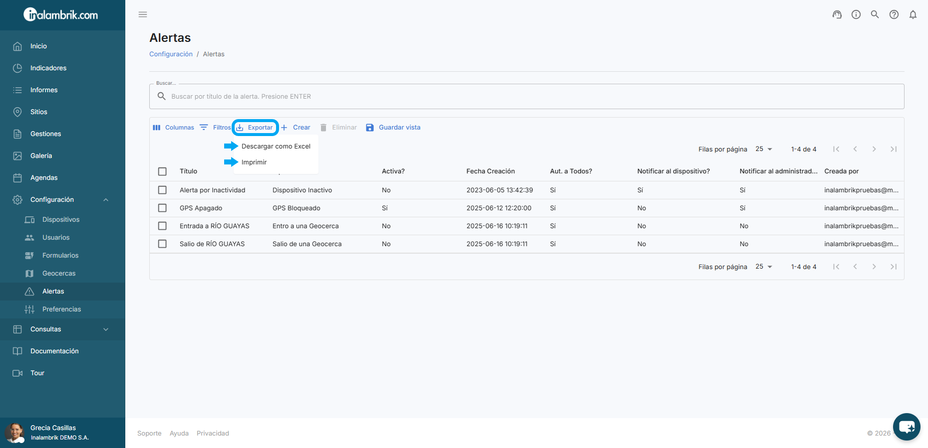 Para obtener un listado de las Alertas de su cuenta, haga clic en Exportar y seleccione la opción de su preferencia.