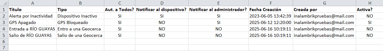 Este panel permite configurar distintos tipos de Alertas que le notifiquen por correo ciertas novedades o actividad de sus dispositivos, por ejemplo: cuando deshabiliten el permiso de ubicación, permanezcan detenidos durante un largo período de tiempo en un mismo sitio, ingresen o salgan de una geocerca, etc.